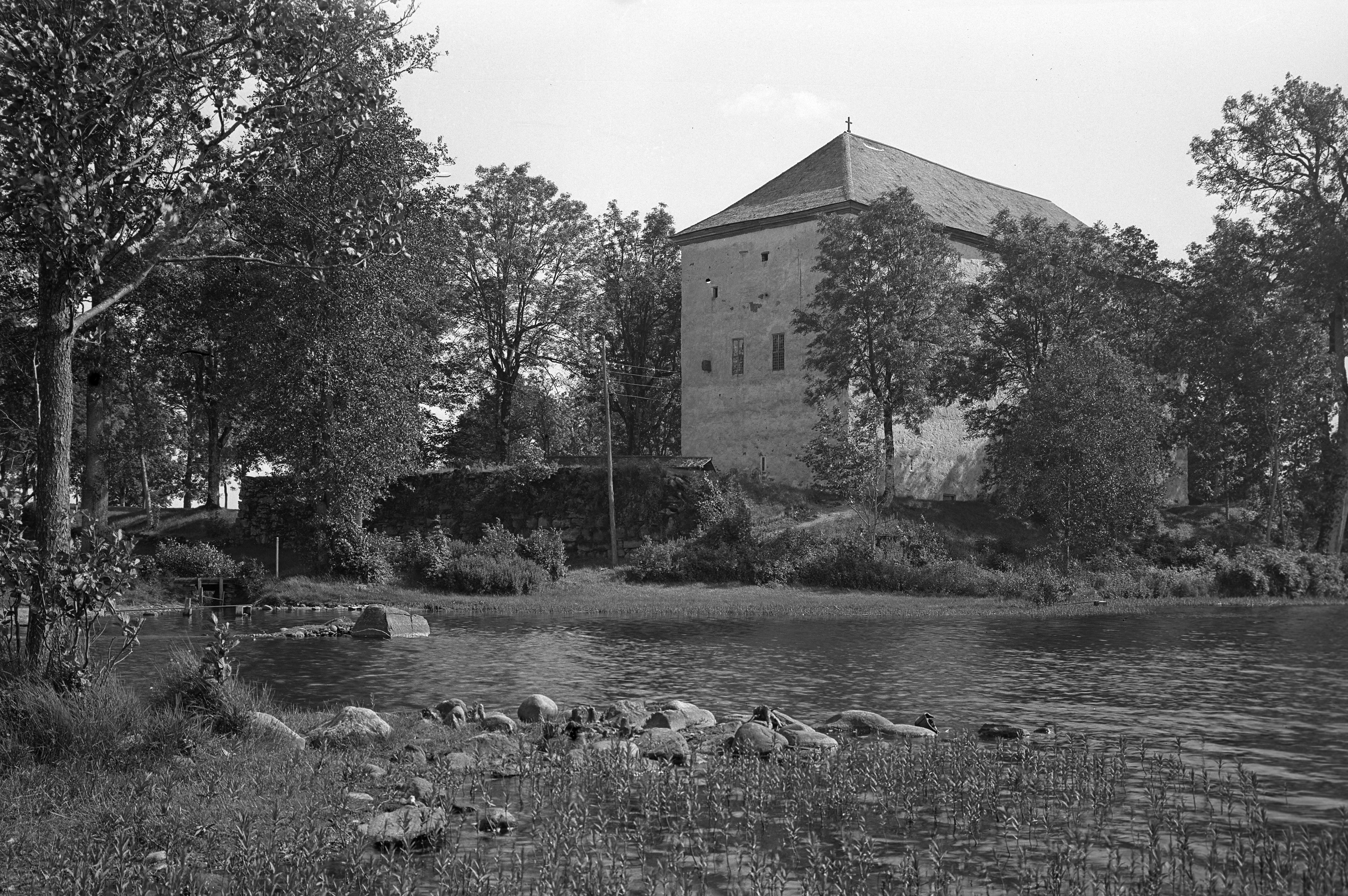 Medeltidsborgen "Torpa stenhus" från sjösidan.