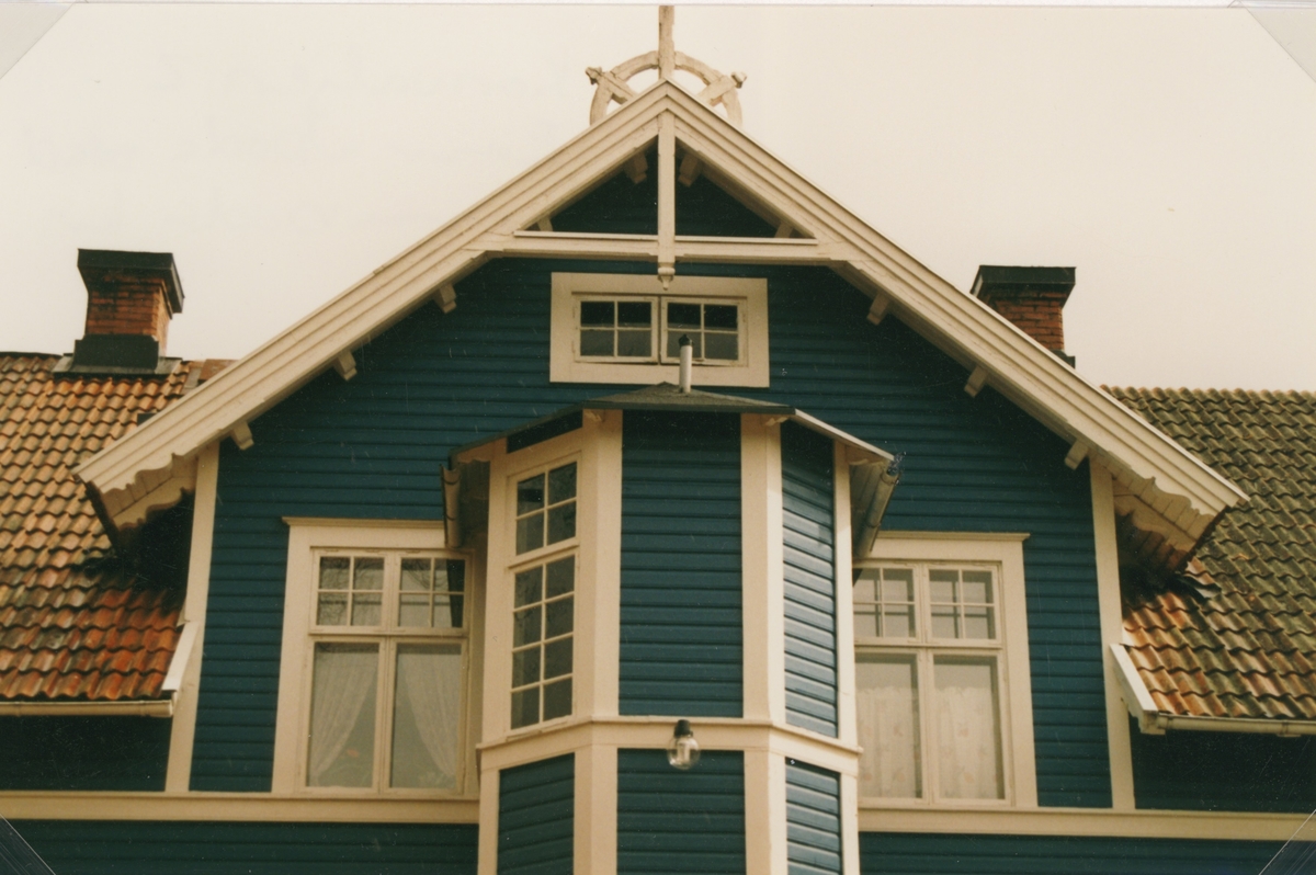 Detalj av ett bostadshus med burspråk i Emmaboda.