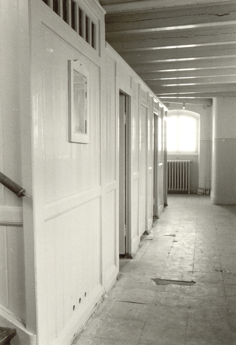 Varmbadhuset gång bakom hytterna runt nedre planet av bassängen. Mot söder.