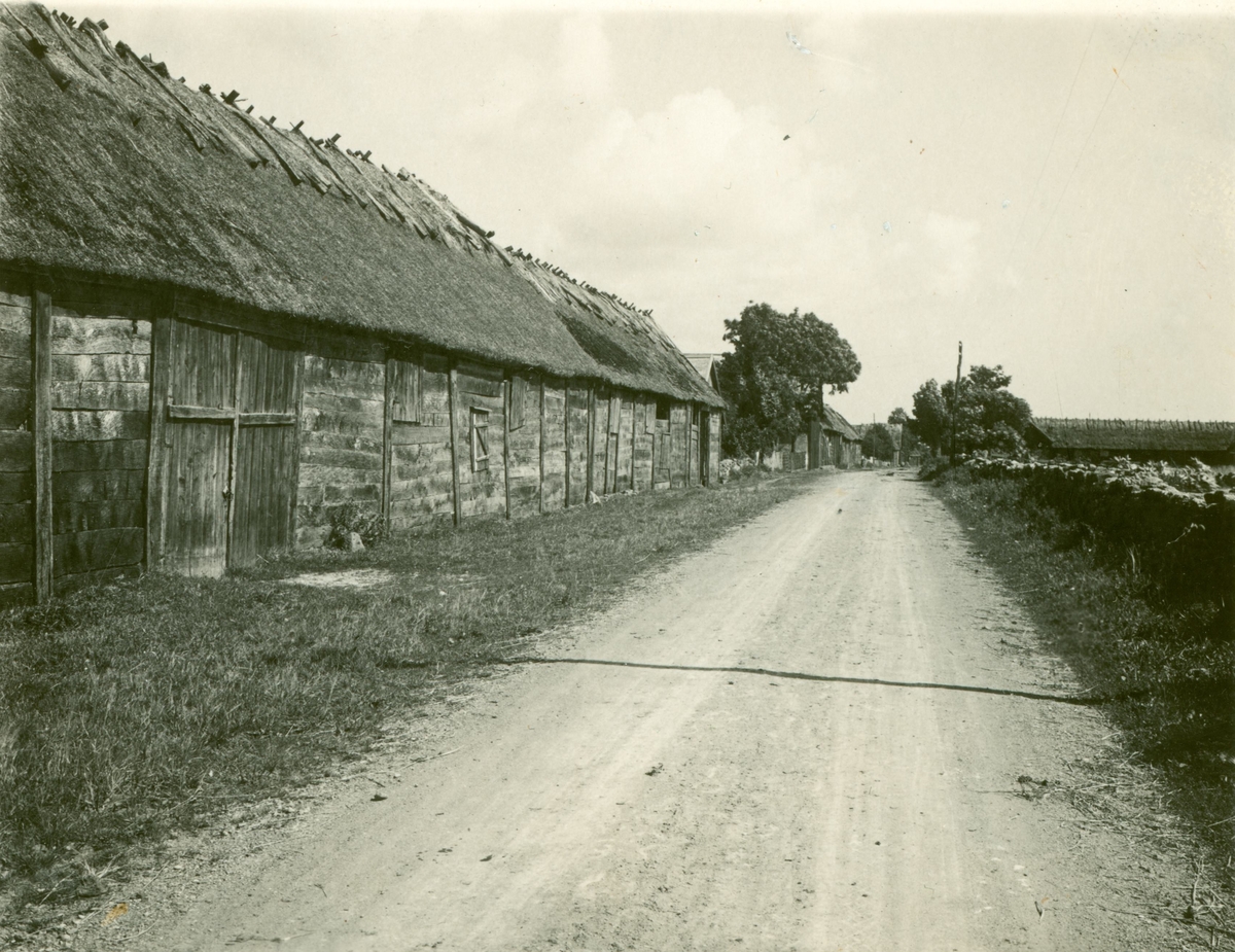 En radby i Gillsättra. Ladugårdar med stråtak.