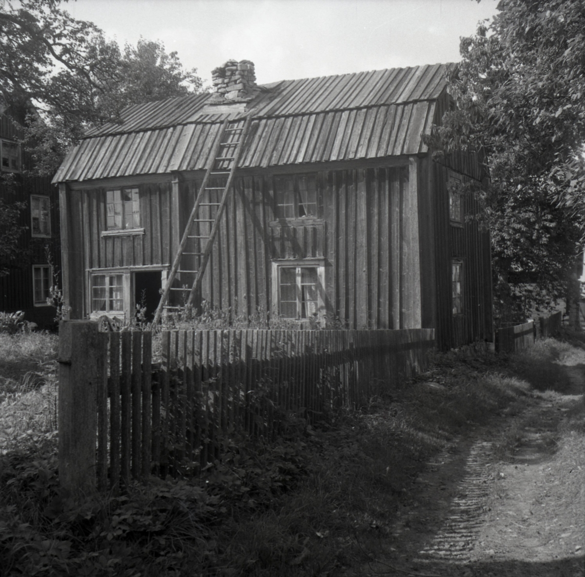 Byggnadens inre fasad med köksingången. Ursprungligt brädtak. Skorsten i kallmur.