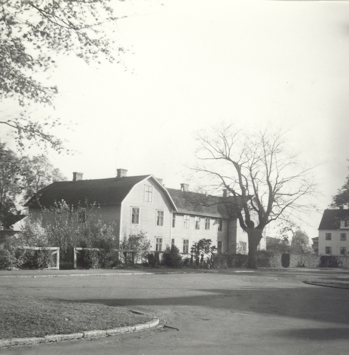 Bostadshus och barn vid trottoaren.
