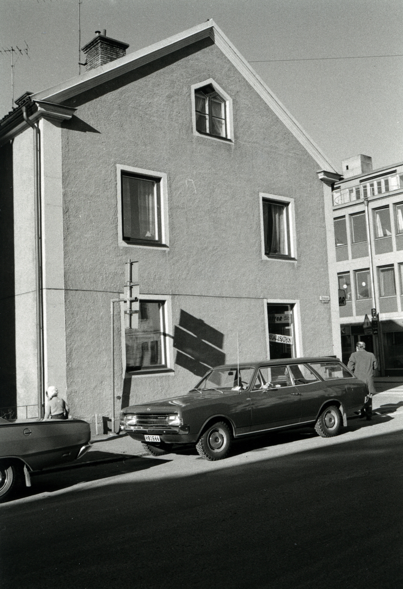 Bostadshus med spritputs på hörnet Strömgatan-Kaggensgatan 37 vid kvarter Brandvakten 3. Mot Strömgatan.