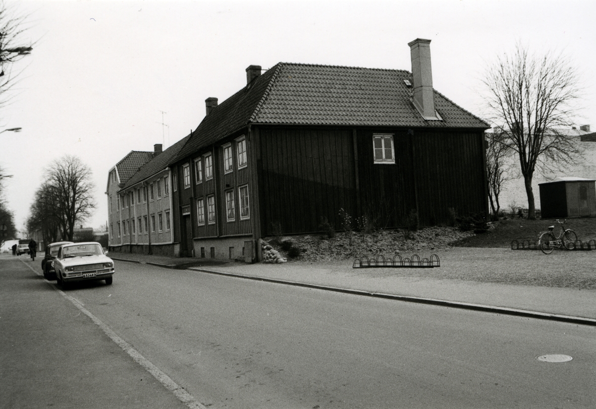 Bostadshus på Norra Långgatan, med bilar och cykel i cykelställ.