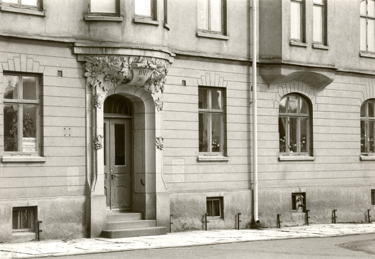 Kvarteret Framsta 5, huset ritat 1910-12 av Josef Fredrik Olson, porten huggen av Josef Anton Schmid (1873-1933). Se artikel av Gunilla Petri i Kalmar Län 1974.