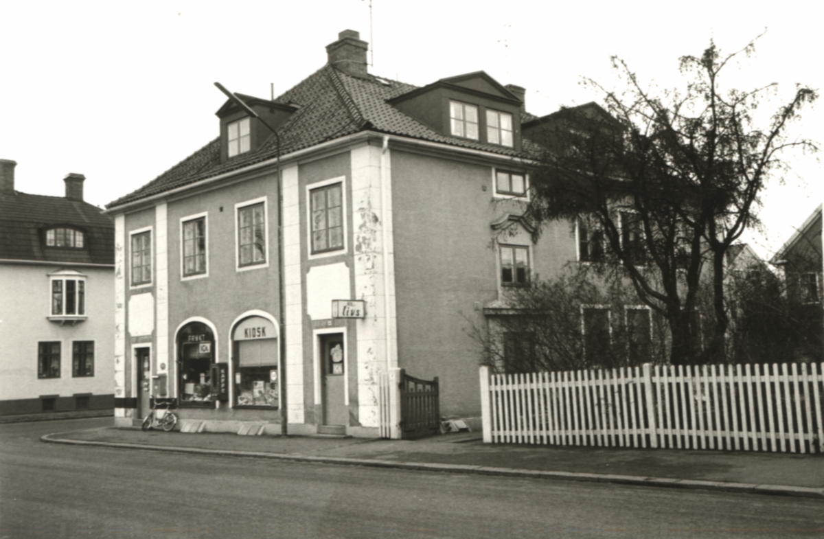 Ett flerfamiljshus med en livsmedelsbutik i entréplanet.