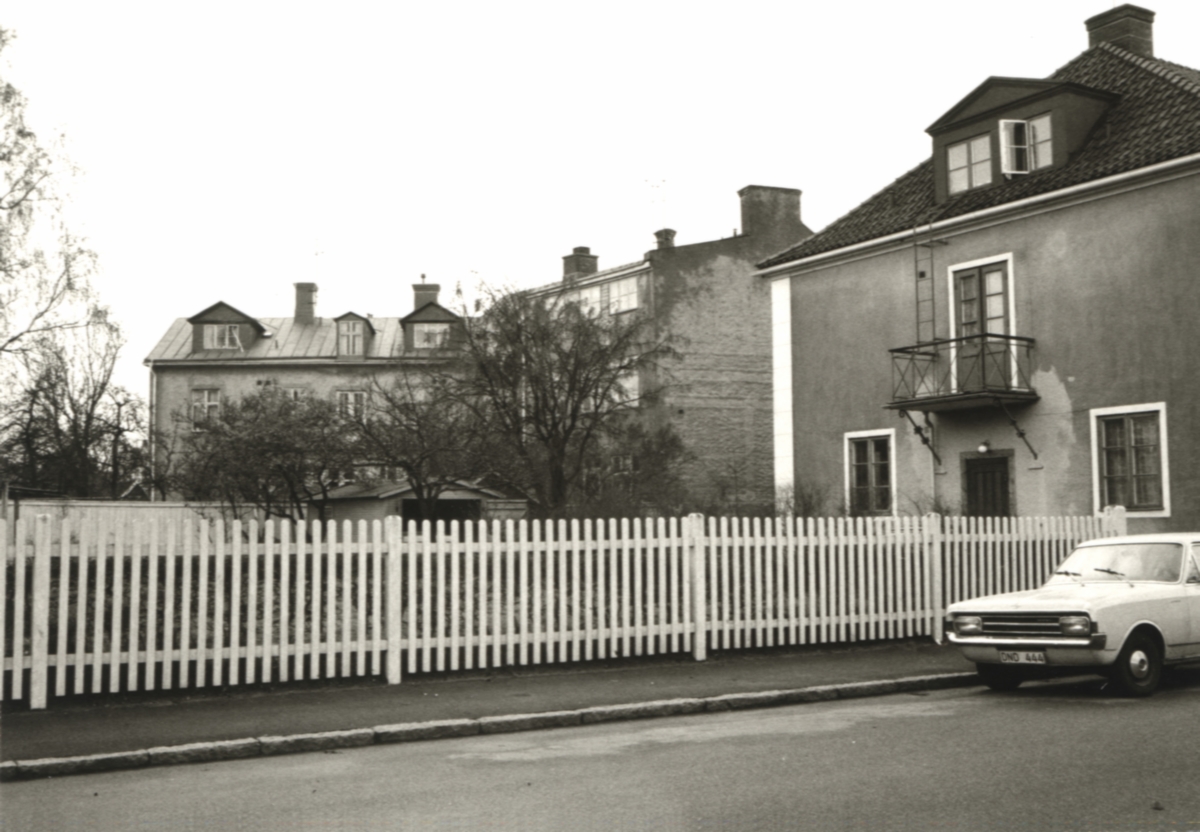 Gårdssidorna av några flerbostadshus, sedda från Ryttaregatan.