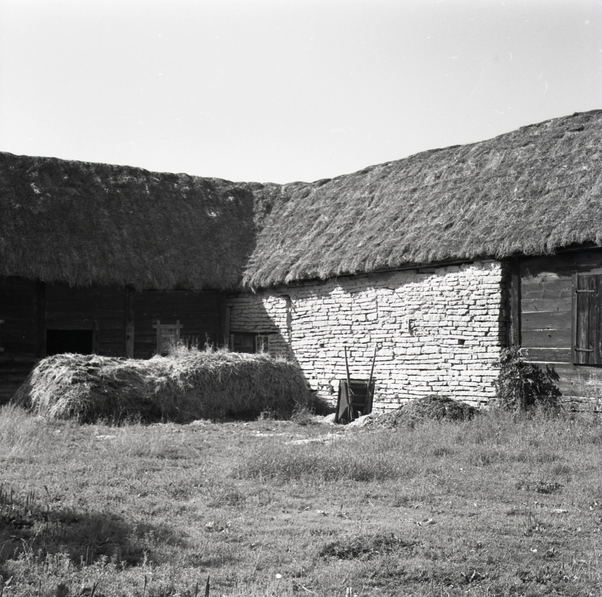 Ladugården i natursten och stråtak på Hagelstad nr. 6.