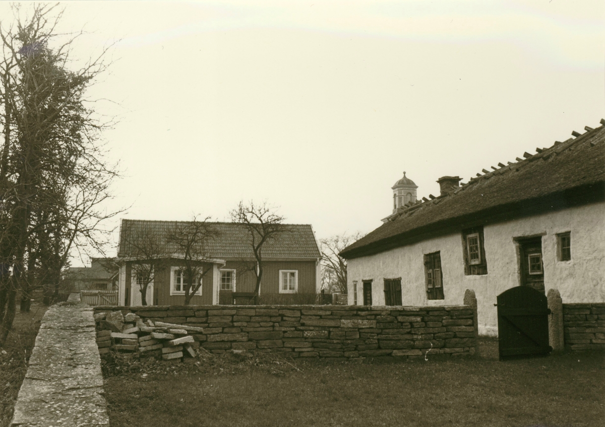 En gård med bostadshus och ekonomibyggnad samt inhägnad med stenmur. Ekonomibyggnaden har takryttare och halmtak samt putsad fasad.