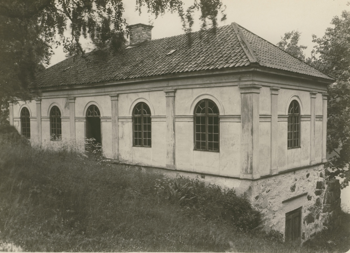 Trädgårdssalongen på Kvistrums herrgård. Mot sjösidan en hög murad terass. Putsat trähus.
