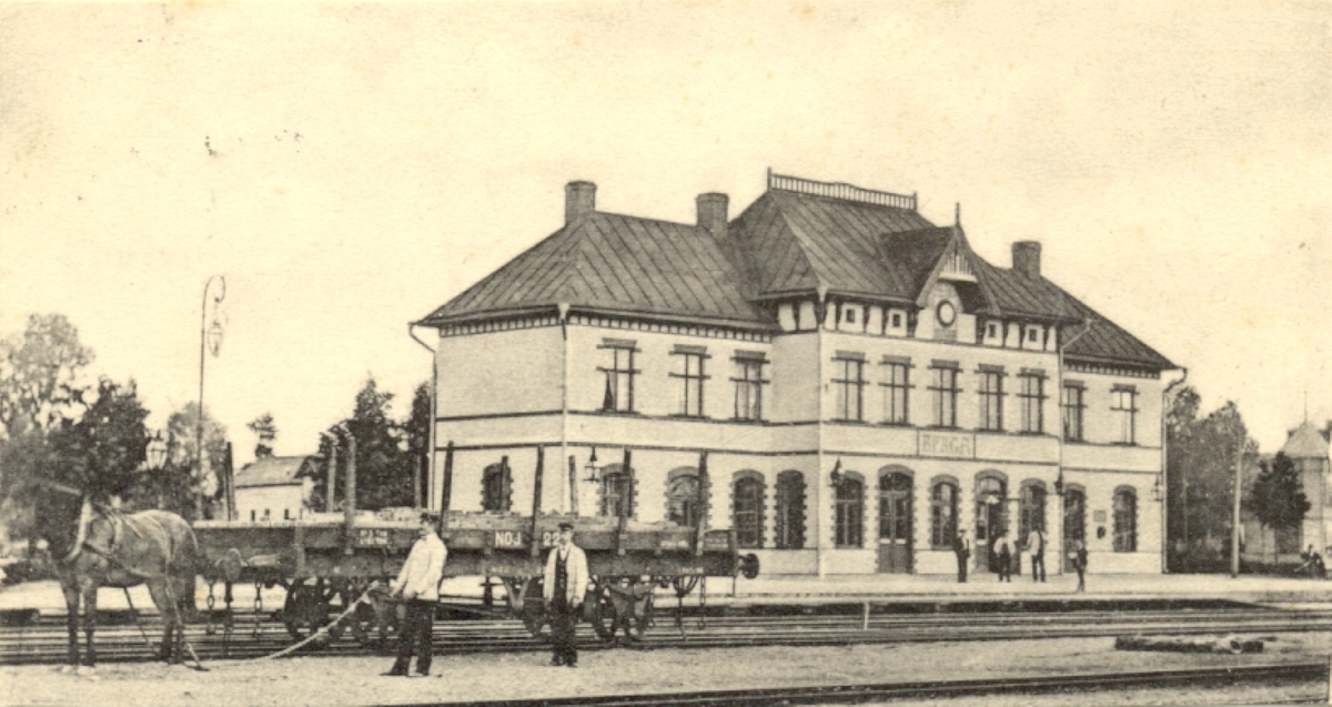 Berga järnvägsstation. Mannen till höger vid järnvägsvagnen är stationskarl Hultgren.