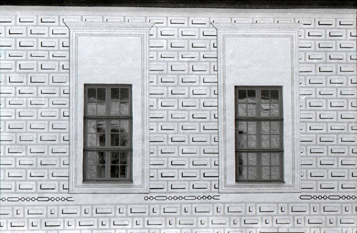 Titel: Östra fasaden på Kalmar slotts inre borggård, detalj av den återställda kvaderstensmålningen.