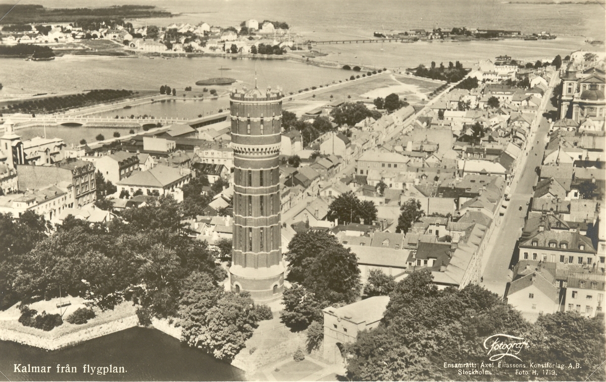 Flygfoto över Kalmar. Staden med hus, domkyrka och vattentorn.