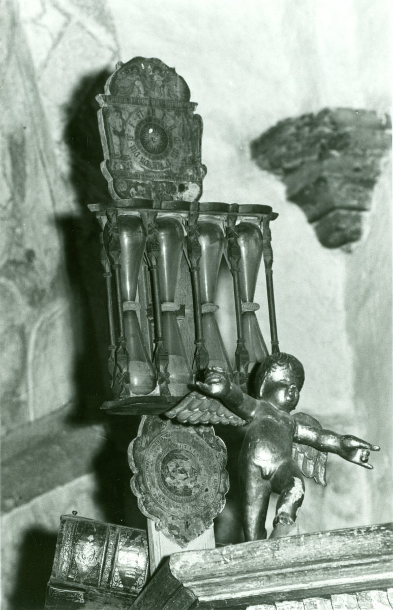 Timglashållare och en skulptur från äldre orgelfasad i Gärdslösa kyrka.