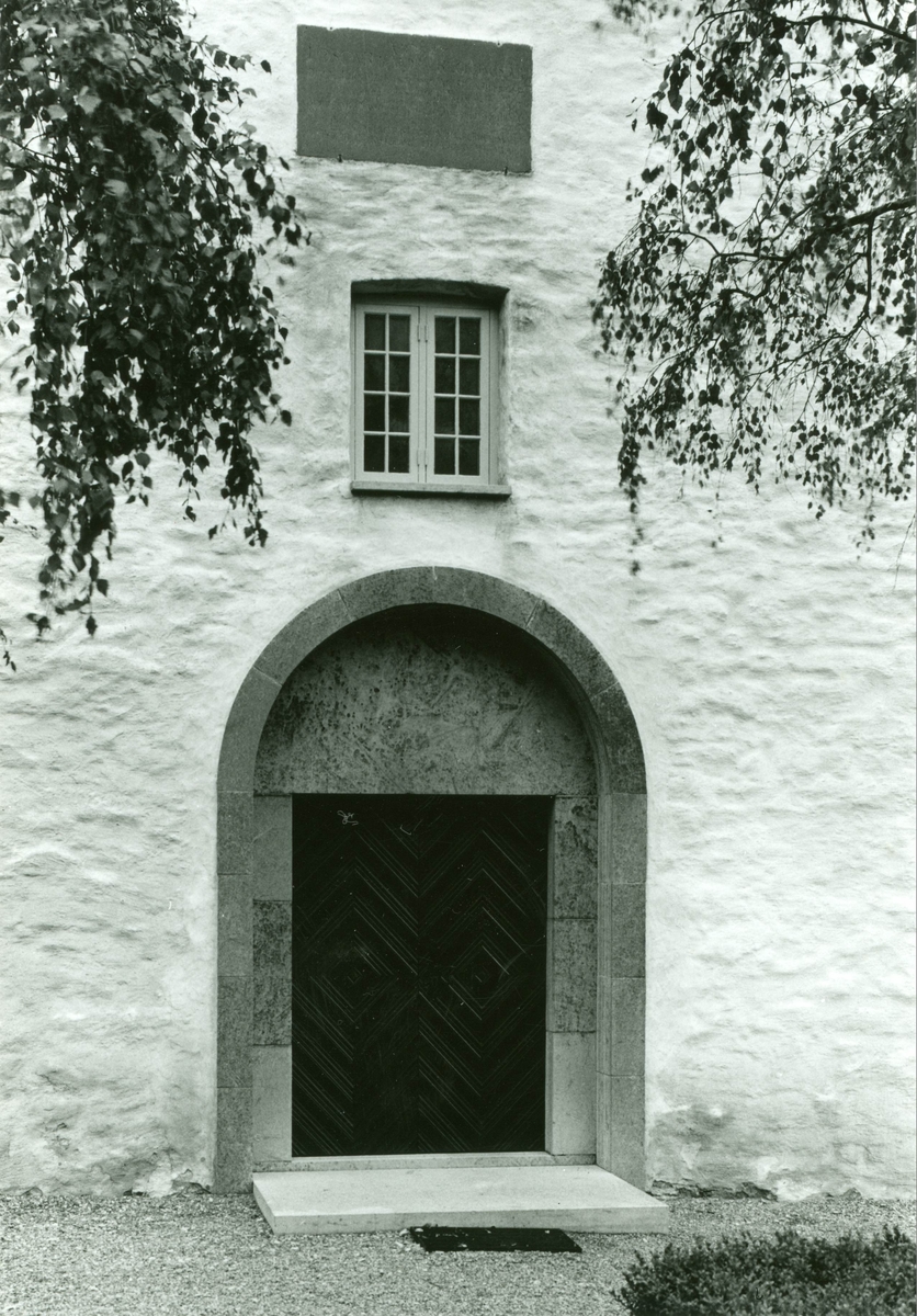 Ett stycke av tornets fasad med den nuvarande västportalen på Gärdslösa kyrka.