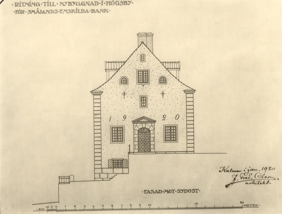 Ritning till nybyggnad i Högsby för Smålands enskilda bank. Kalmar i januari 1920 J. Fred. Olson, arkitekt. Fasad mot sydost.