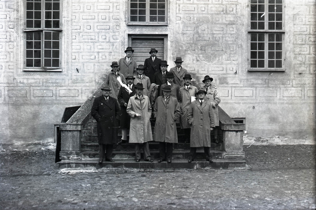 Grupporträtt vid slottet, bilden skannad från glasplåt.