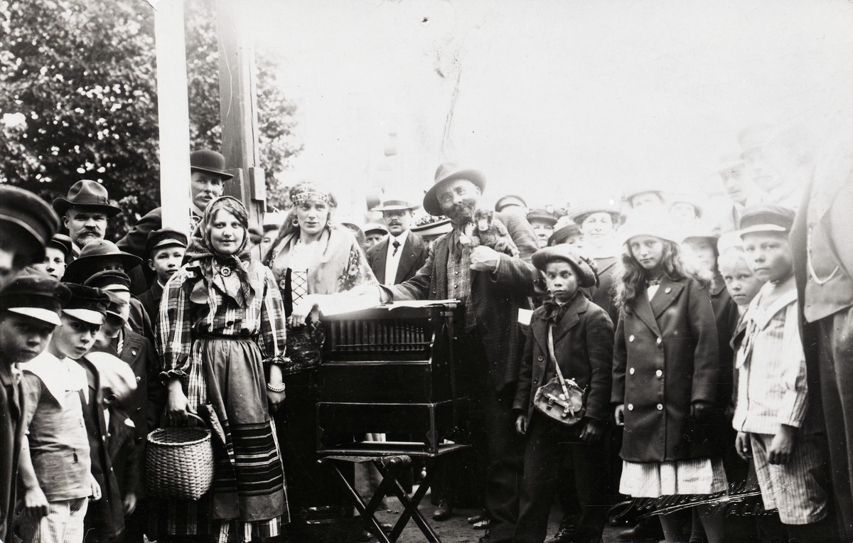 En positivhalare omgiven av åhörare under hantverksmässan som anordnades på Norrgård av Kalmar Fabriks- och Hantverksförening.