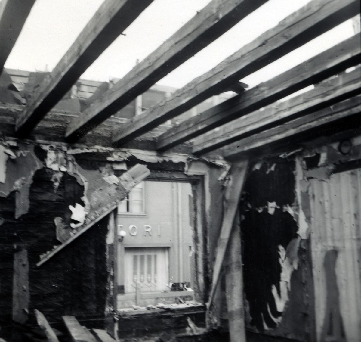 Rivning invändigt av väggar med liggande träpanel och takbjälkar i hus i kvarteret Krögaren på kvarnholmen
