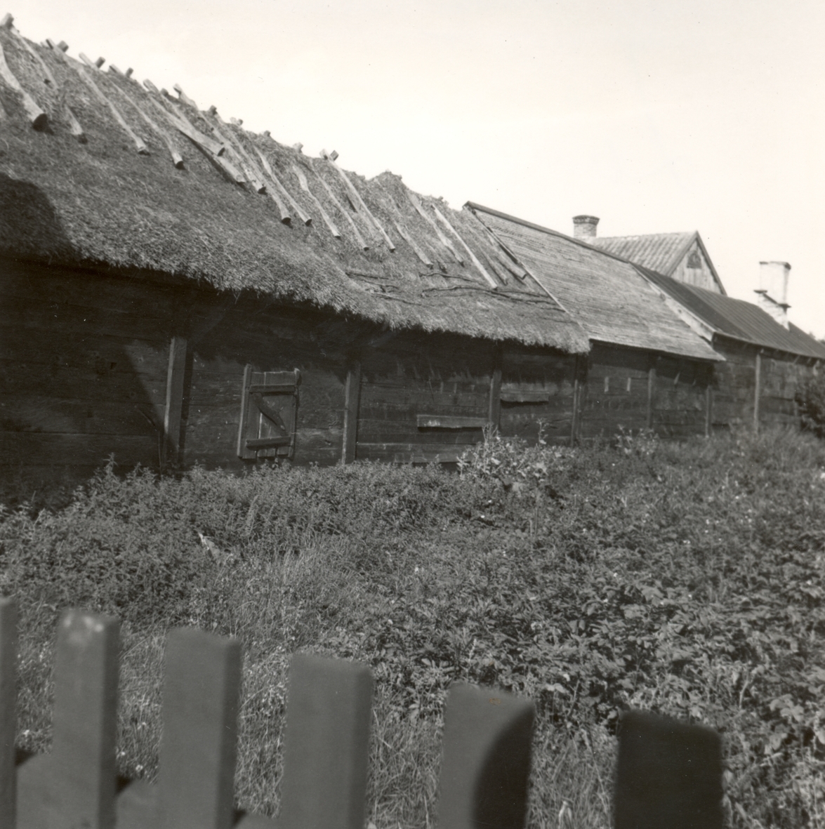 Ekonomibyggnad med stråtak och takryttare. Del av radby i Himmelsberga.