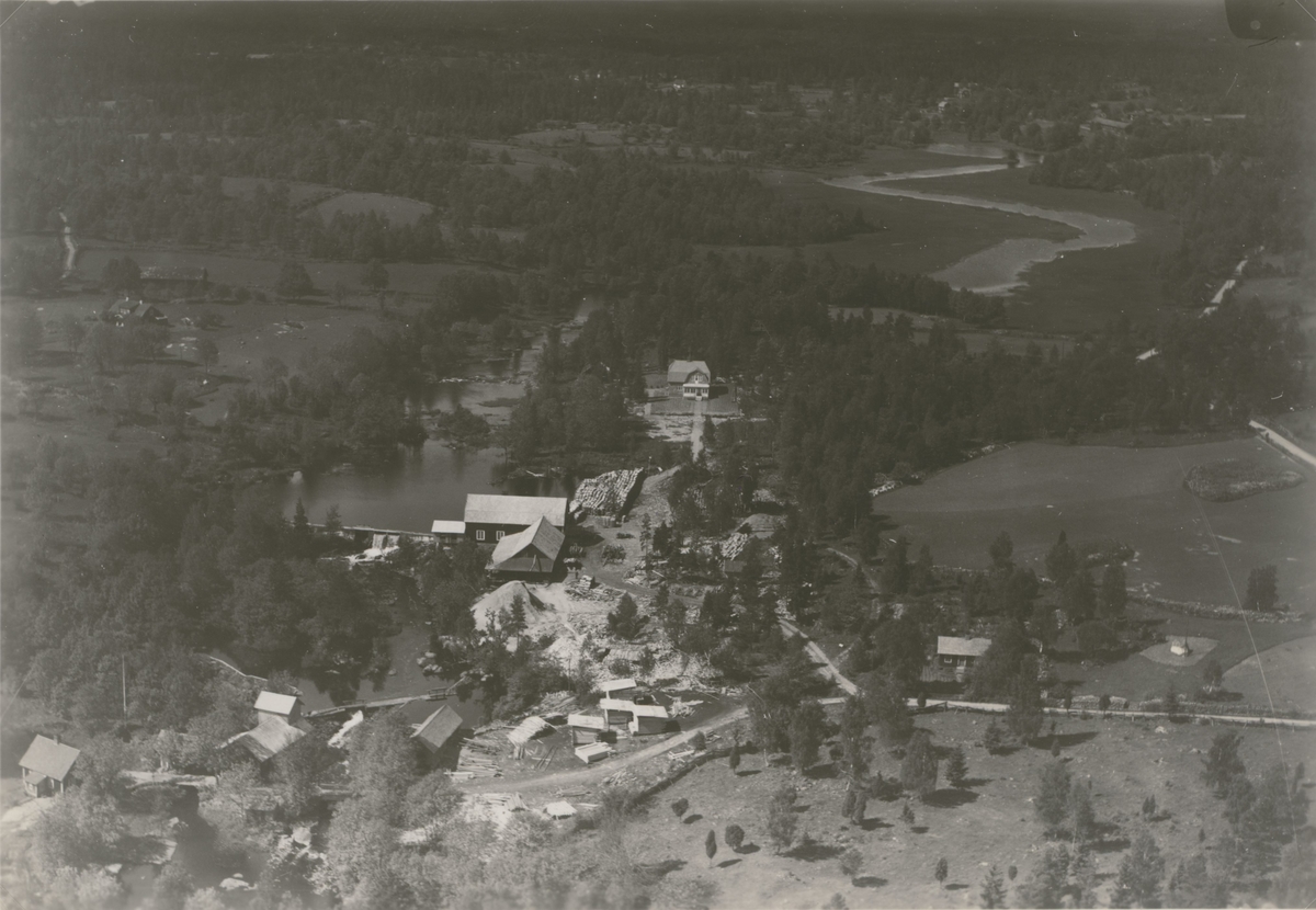 Flygbild över en gård med såg i förgrunden, troligen i närheten av Grönskåra.