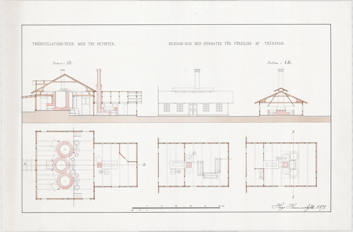 Kolorerad arkitektritning av Hugo Hammarskjöld. Trädestillationsverk, Bruzaholm 1870-1871.