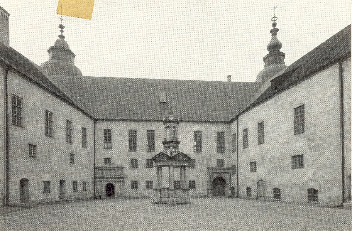 Kalmar slott. Borggården sedd mot söder. Mitt i bilden brunnsöverbyggnaden; i bakgrunden till vänster kyrkportalen och till höger sydvästra borggårdsportalen.