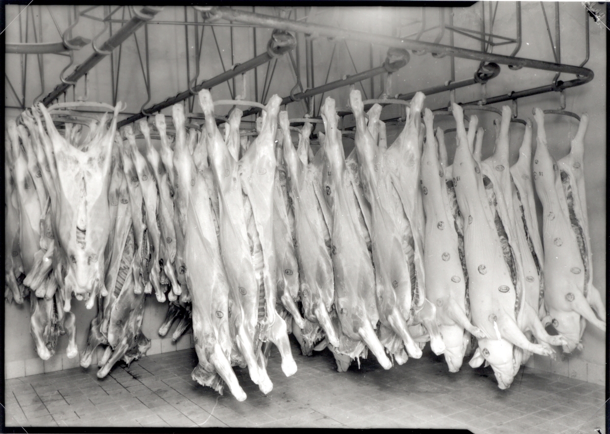 Interiör från Kontrollslakteriet i Kalmar. Griskroppar på krokar.