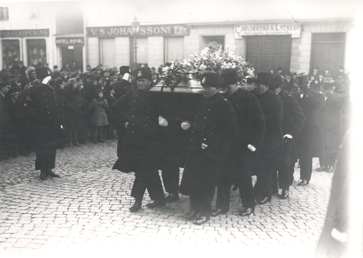 Begravning. Möjligen stadsfiskal Lindells. Bilden tagen på Stortorget/Västra Sjögatan.