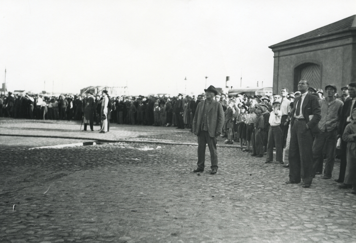 Folk står och tittar på när brandmän försöker kontrollera branden i Ångkvarnen i Kalmar, juli månad 1935.