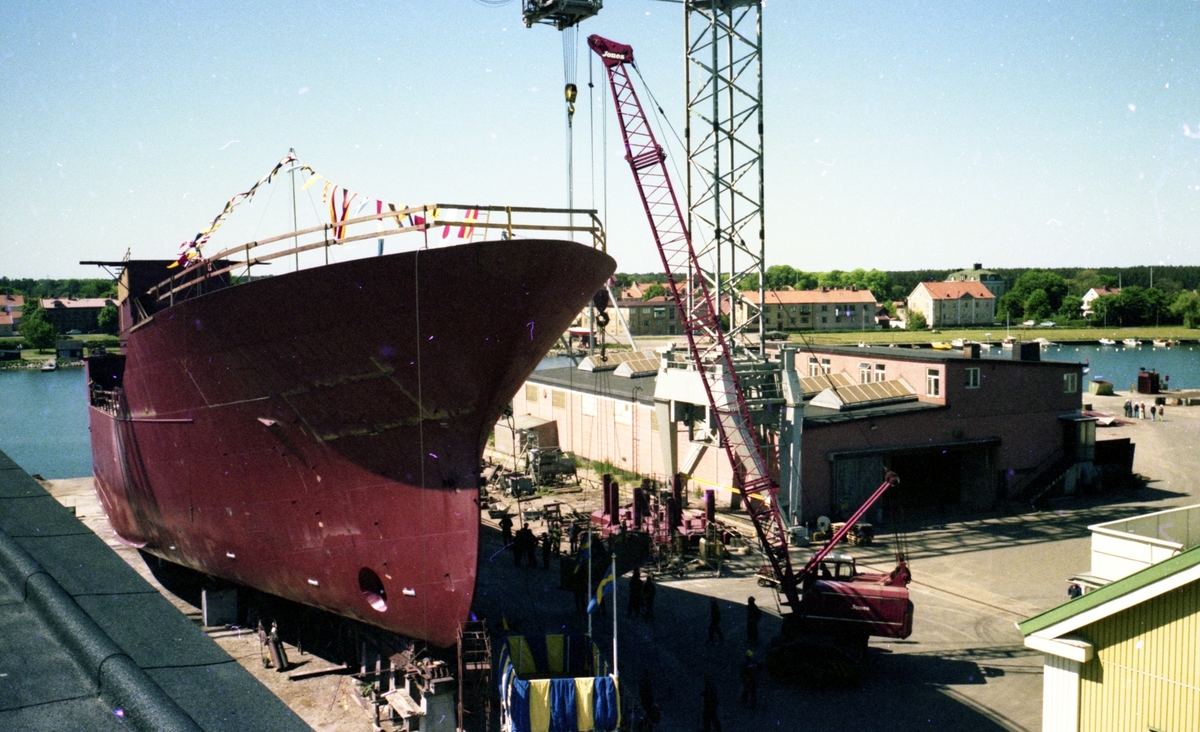 Ett fartyg på en stapelbädd på varvet i Kalmar. Plåtverkstaden till höger om skeppet.