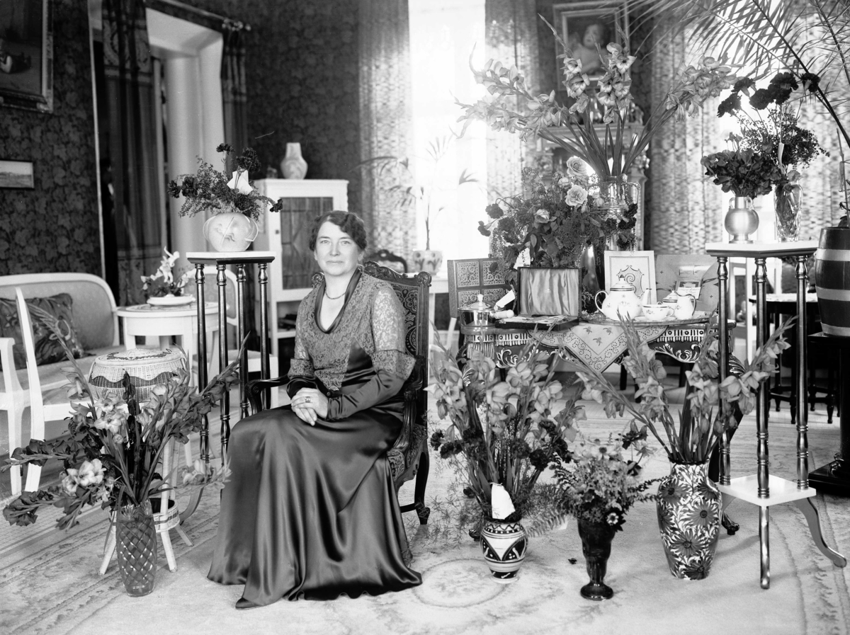En kvinna som sitter vid ett blomsterarrangeman på en födelsedag. Enligt Walter Olsons journal är bilden beställd av direktör Alb. Lindeström.