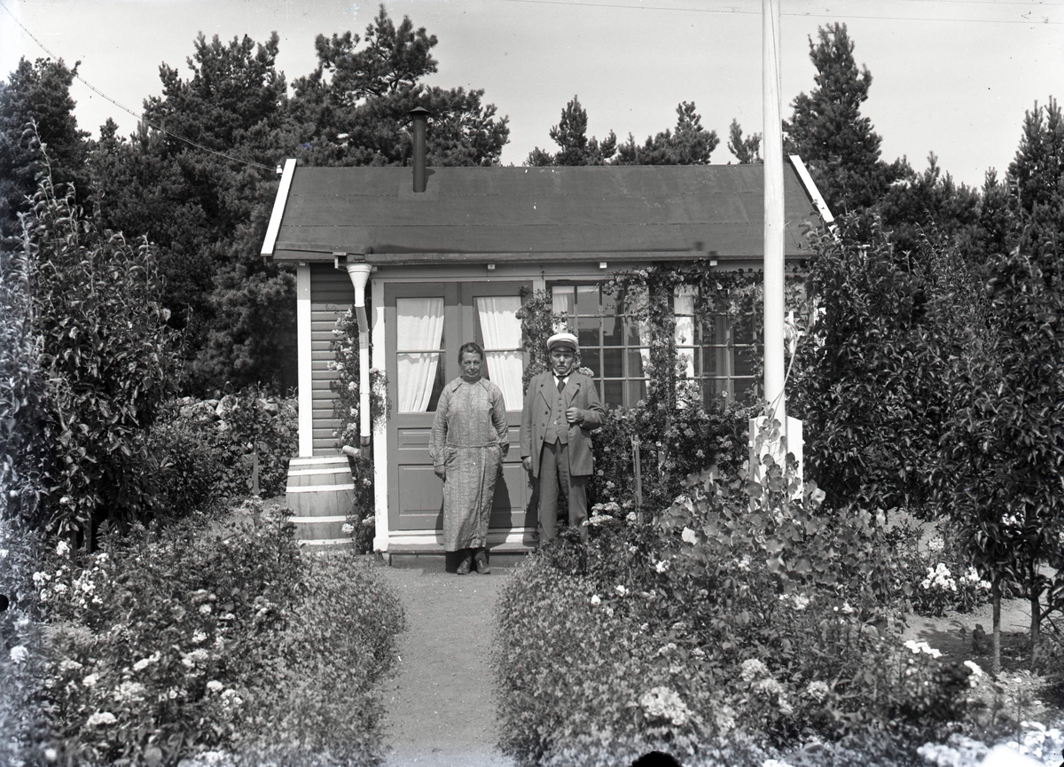 En man och en kvinna vid en liten stuga i Kalmar södra koloniområde, fotograferat omkring 1930. Kalmar södra koloniförening grundades 1917 och har idag 105 kolonilotter. Området ligger strax söder om länssjukhuset i Kalmar med huvudingång från Stensbergsvägen.