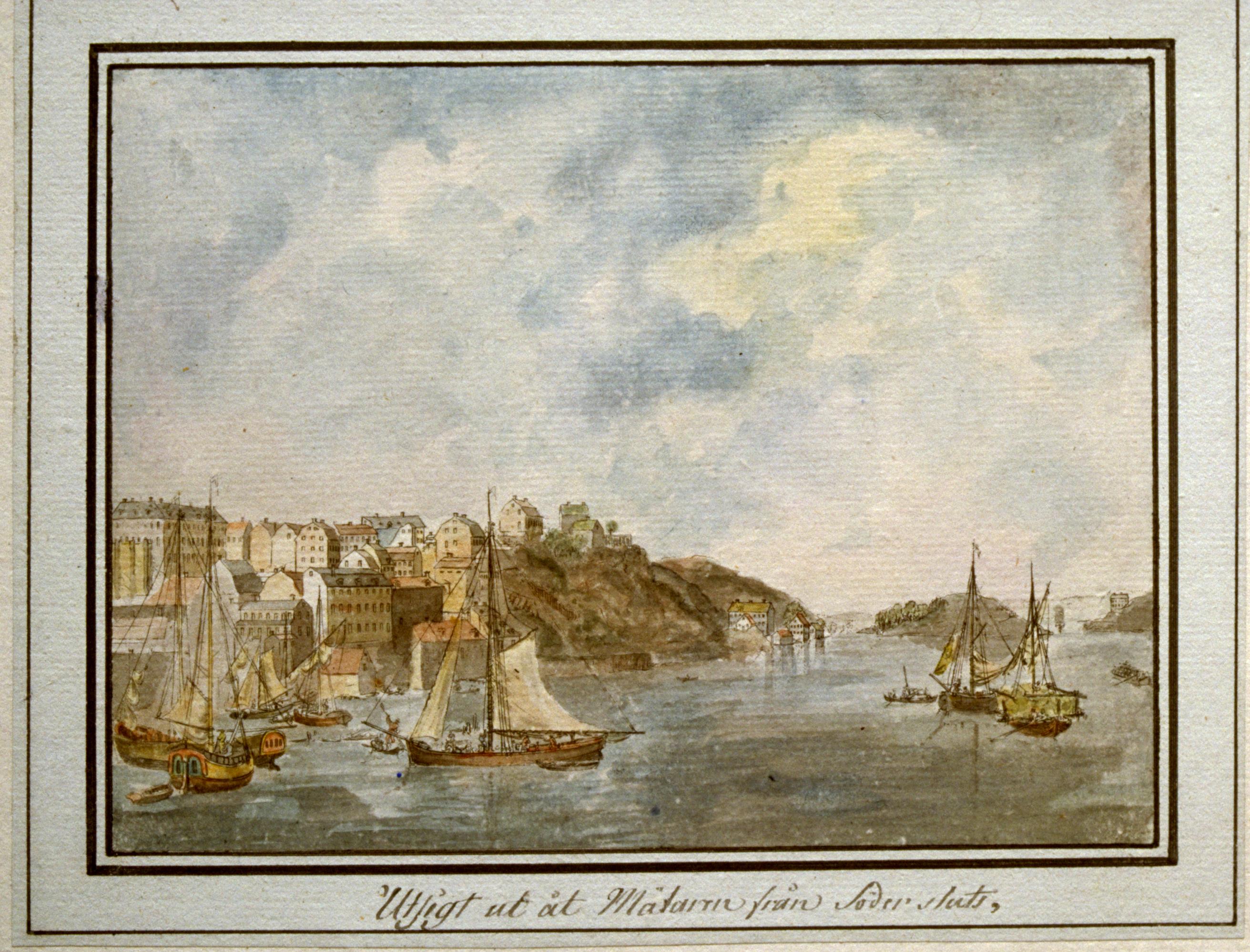 Utsikt mot Söder Mälarstrand från Slussen. Akvarellerad konturetsning av av Martin Rudolf Heland efter Elias Martin.