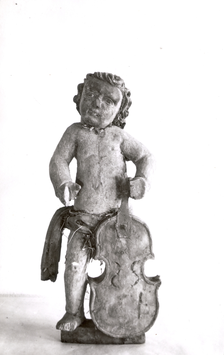 Titel: Skulpturen är en putto. En allegorisk liten amorin som ofta ingick som staffage i altaruppsättningar eller (ännu vanligare) på orgelfronter. De hade i sina händer olika ikonografiska föremål som tydliggjorde sammanhangen.