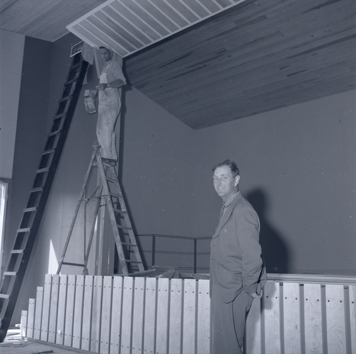 En målare och en man i kostym i hembygdsgården i Köpingsvik.