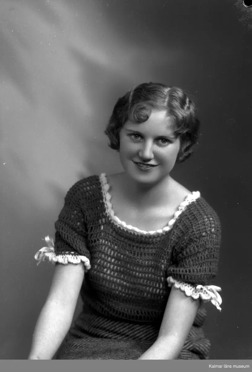 Ateljébild på en kvinna i jumper. Enligt Walter Olsons journal är bilden beställd av Elsa Skogh ifrån Centrum (biografen) på Larmgatan i Kalmar.