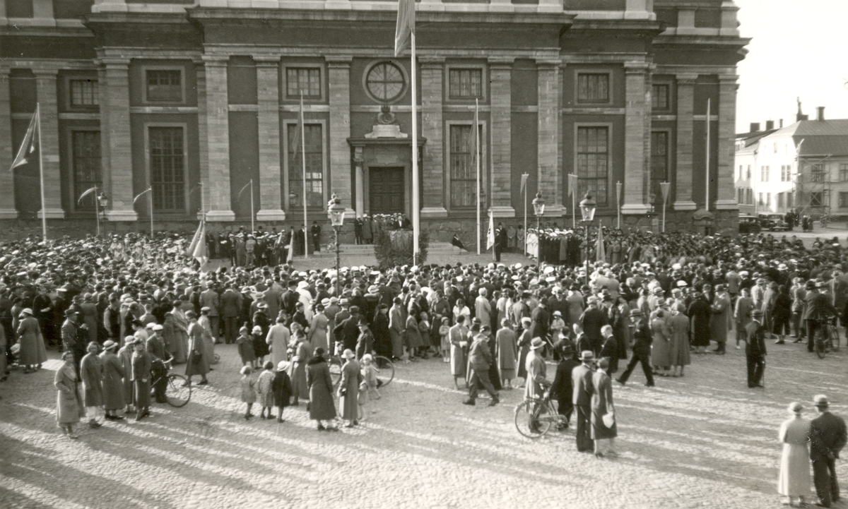 Militär uppvisning på Stortorget i Kalmar. Svenska flaggans dag firas i början av1930- talet. Musikkåren Lyran t.v om kyrktrappan.