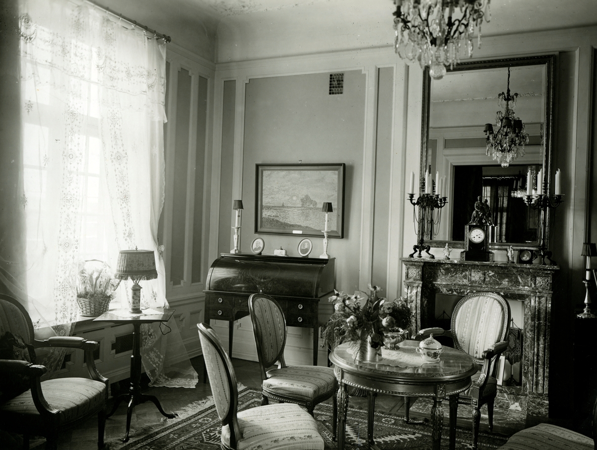 Salong på Bergagården med öppen spis, chiffonje, bord och stolar.