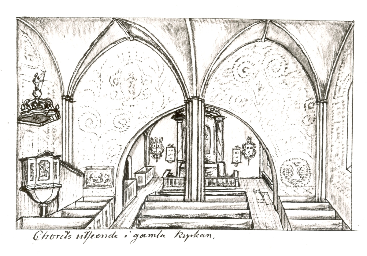 Ålems gamla kyrka, östra delen samt koret. Teckning av N J Löfgren 1820. Efter Löfgrenska samlingen i ATA; Kungliga Vitterhets- Historie- och Antikvitetsakademien. Här synes den breda triumfbågen mellan långhuset och koret, vidare skeppets pelare och valv. Alldeles till höger om bågen synes det målade fältet med Johan Skyttes och hans makas vapen samt inskription, angående donationen av kyrkans målningar. På motsvarande plats vänster om bågen hänger den ännu bevarade oljemålningen med Lazari uppväckande. Vid båda sidorna om altaret nummertavlor samt två adliga banér, det Ribbingska och det Mörnerska."