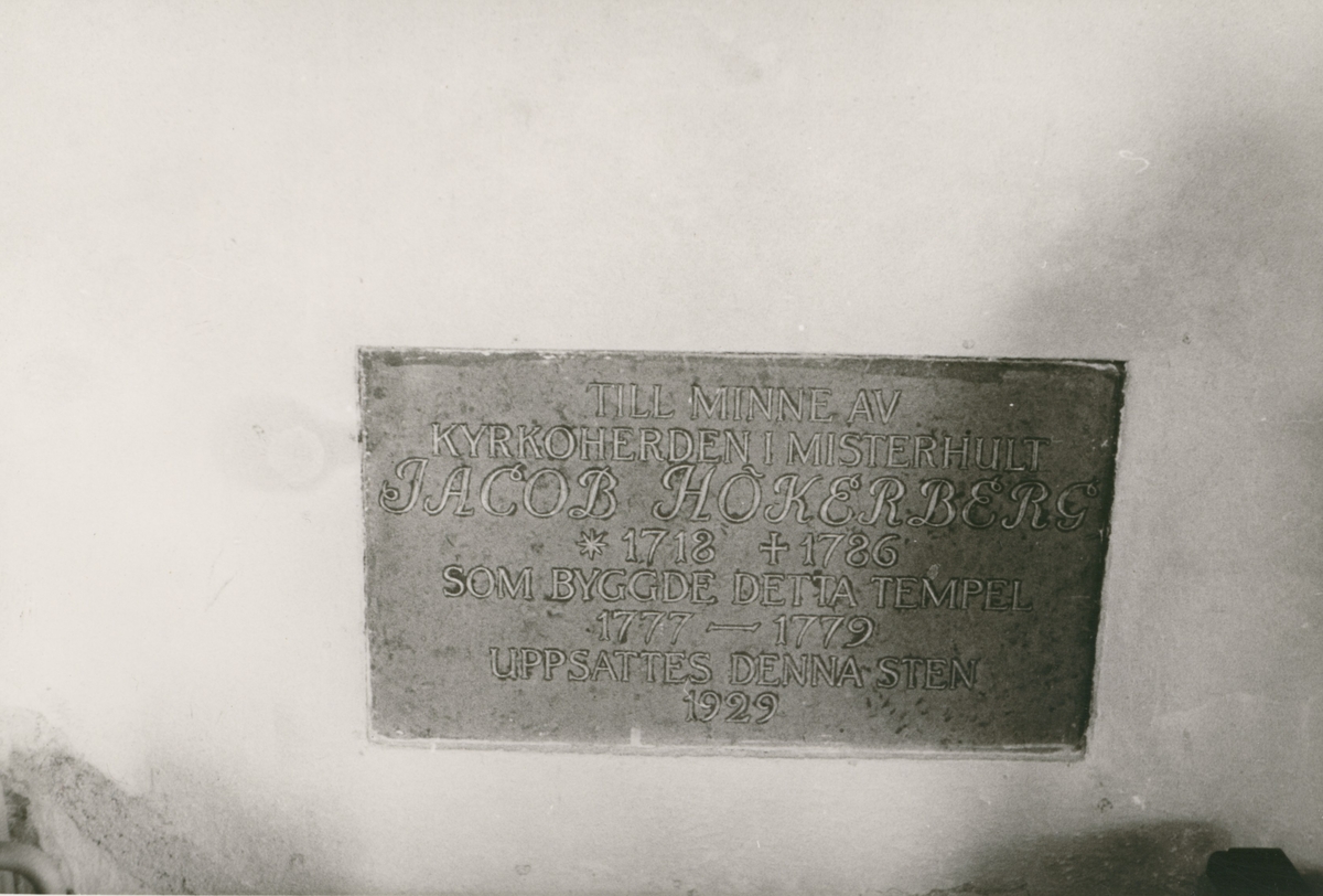 Minnestavla under altarskåp i Misterhults kyrka.