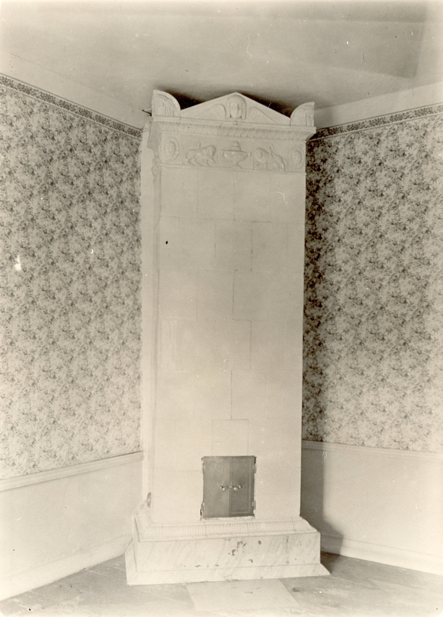 Huvudbyggnaden: rummet norr om salen. Kakelugn. Helvit. Sockeln målad i grå marmor. Golvet målat gult med svart stjärnmönster m.m
