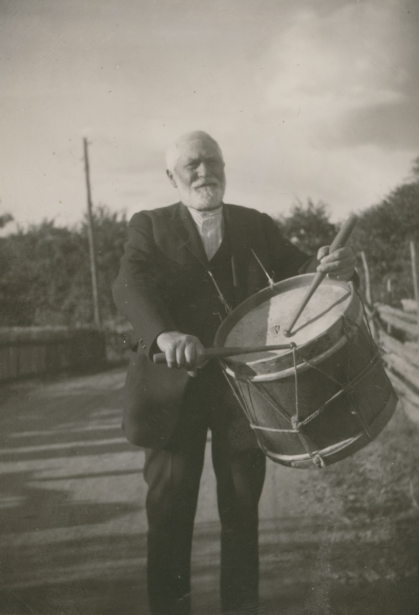 Kråkstorp (Stora Ånhultstorp) Murare Gustafsson håller i Kråkstorps (Stora Ånhultstorps) bytrumma. Trumman var fortfarande i bruk när det kallades till bystämma år 2002.