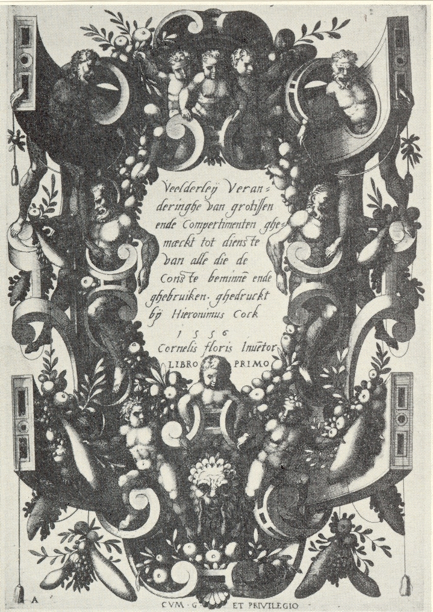 Cornelis Floris (Till vänster titelbladet till "Veelderley Veranderinghe van grotissen..." Första boken tryckt 1556. Till höger Blad med grotesker daterat 1554.