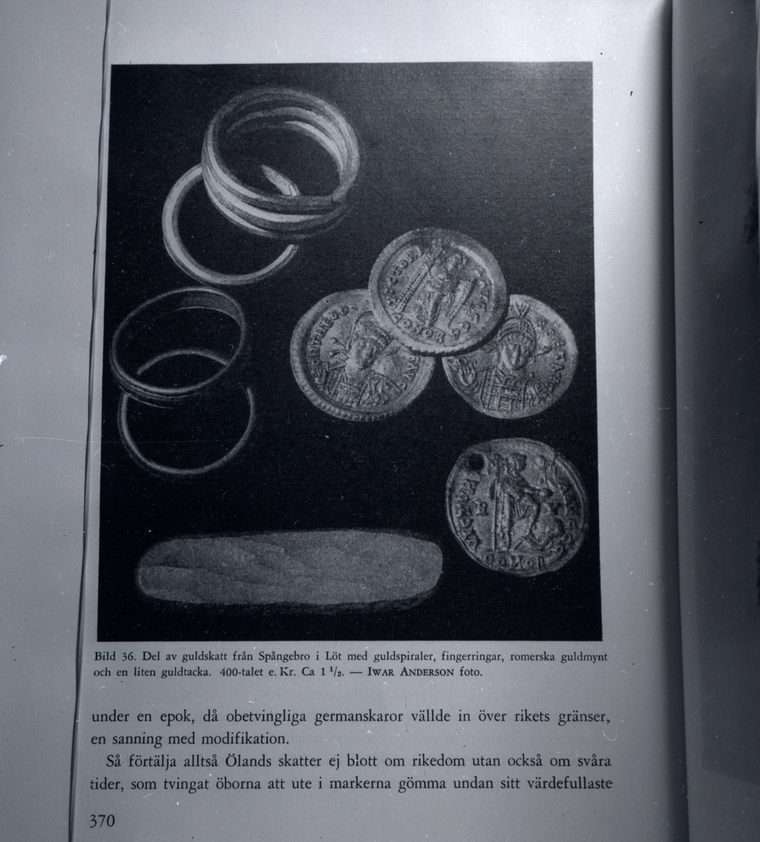 Del av en guldskatt från Spångebro i Löt med guldspiraler, fingerringar, romerska guldmynt och en liten guldtacka. 400-talet efter Kristus.