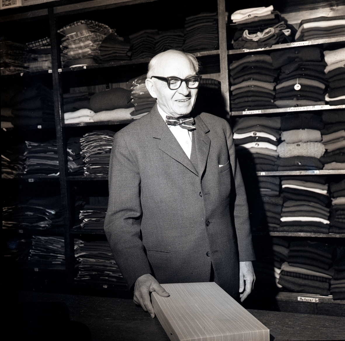 Grosshandlare Karl Danielsson bakom disken expedierar sina kunder tillsammans med Torsten Lundin dagen innan nyårsafton. Danielsson fyllde åttio år vid fototillfället.