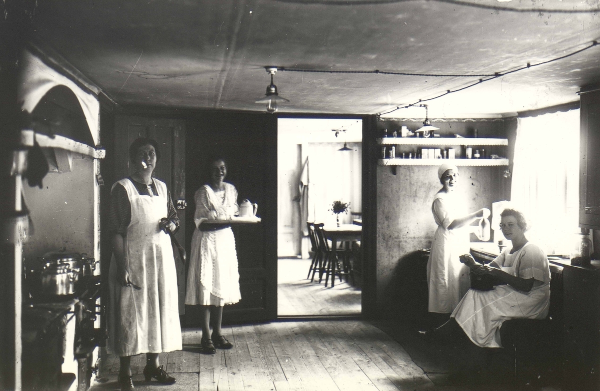 I Badrestaurangens kök. Till vänster Valborg Molin och stående vid fönstret Agda Thunberg. De två andra damerna okända till namnen. Observera köksinteriören samt armaturerna i taket.