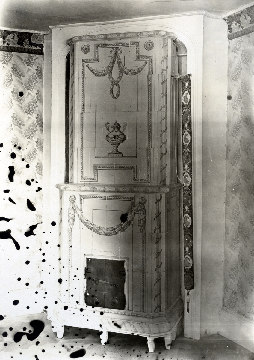 Berga herrgård. Lilla matsalen i bottenvåningen. Kakelugn med dekor i grönt, krön- och skänkgesimserba i grönt och blek lila. Vitmålad träfot, smidda järnluckor.