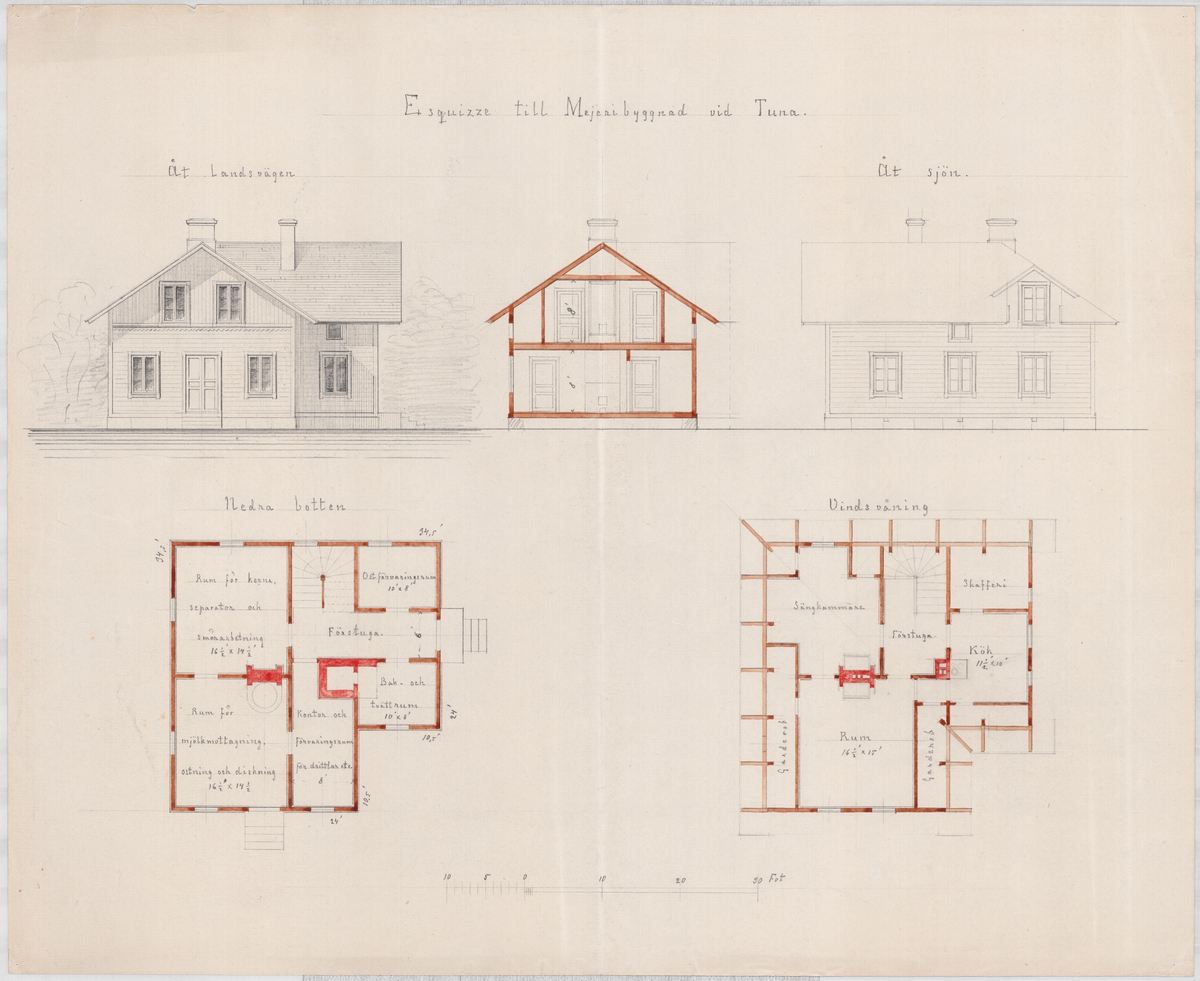 Kolorerad arkitektritning av Hugo Hammarskjöld. Projekt: Mejeribyggnad vid Tuna. Utan årtal.