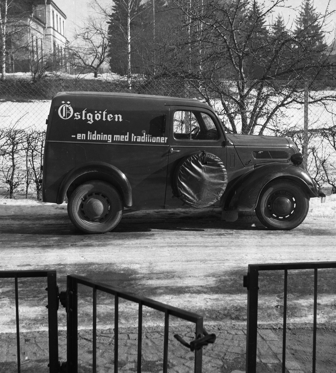 Tidningsbil från tidningen Östgöten. Slogan på bilens sida lyder: Östgöten- en tidning med traditioner.